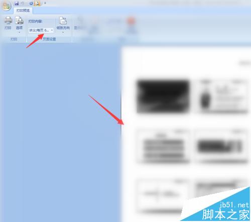 6、当然,我们也可以在选择打印预览后,直接选择打印机的设置,可以看到箭头所示的“每页幻灯片数,6页”还有预览的图示。这里是再次的确认是否一致。避免打印后发生错页的现象。