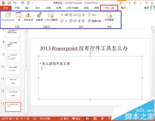 6、设置完成后,回到ppt文档中,可以看到菜单栏中已经多了一个开发工具的菜单项,在里面有各种编程会用到的工具