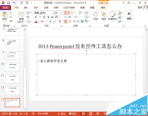 1、小编使用的是2013版的office powerpoint,默认是没有控件工具栏的,下面小编就来教大家怎么让它显示出来,首先点击菜单栏中最左边的“文件”