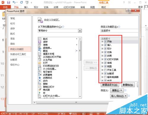 4、点击“自定义功能区”后,就打开自定义功能区设置页面,如下图所示,在右边的列表中默认显示已经可以在菜单栏中显示的菜单,没有勾选的是不会显示的