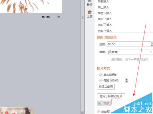6、如图所示,我们点击箭头所指的“应用于所有幻灯片”按钮。