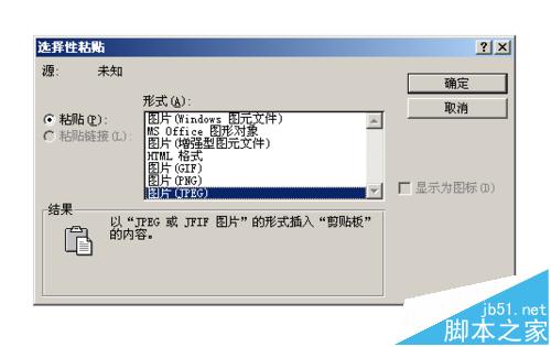 有时我们点击选择性粘贴之后没有“图片(JPEG)”选项,这时我们随便选一项点击确定,然后复制粘贴的图片,再选择“选择性粘贴”。