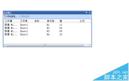 8、我们用同样的方法,把其他几个单元格都添加到监视,最后得到下图所示,这样我们就实现了对单元格数据的监视,各单元格的数据一目了然,如果有公示的话,也会自动实现公式监视功能。