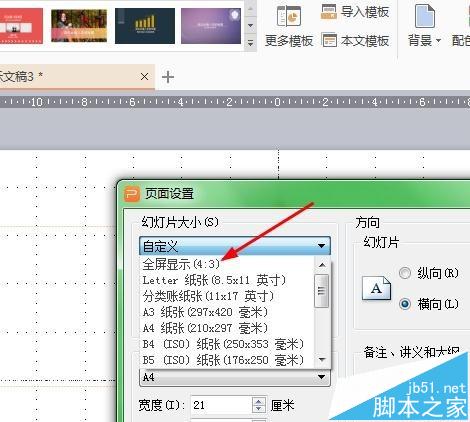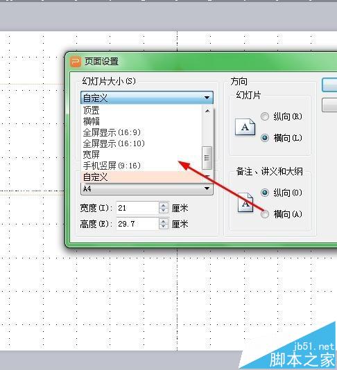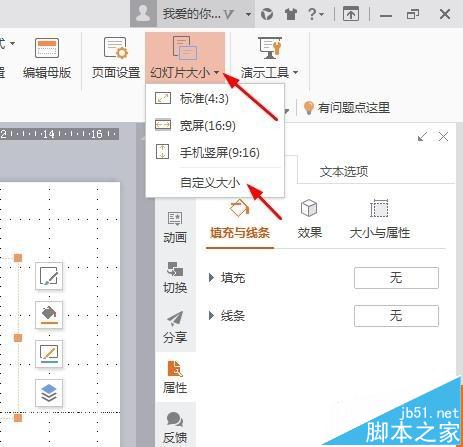 2、我们在找到幻灯片大小,点击倒三角菜单,弹出设置,选择自定义。