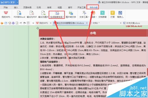 1、在文档工具栏的右侧,有一个特色功能工具按钮,点击一下这个特色功能在下方可以选择文档格式的输出或是生成二维码,如图所示。