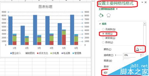 6、设置网格线(短划线)。设置主要网格线格式——实线——颜色——短划线类型(短划线)。