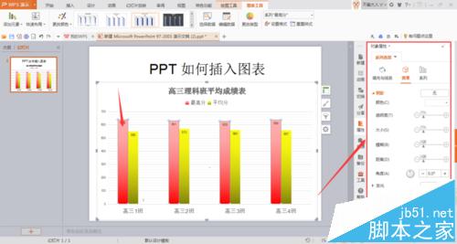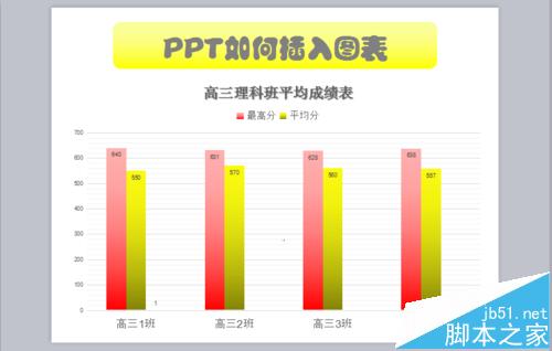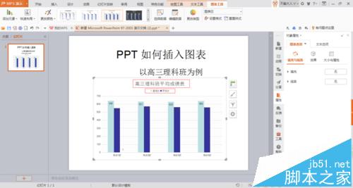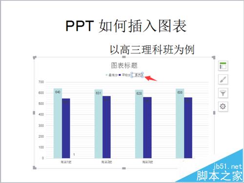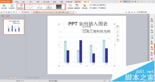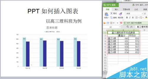 6、弹出一个名为【WPS演示中的图表】的EXCEL表格。将事先做好的EXCEL表格打开,复制,粘贴到WPS演示中的图表的EXCEL表格中。点击幻灯片图表,查看是否有将所需数据选中,如果没有,用EXCEL直接拖拽调整。 如图,原excel有高三6个班级,如果只需要做4个班的表格,则只选择4个班的数据即可。