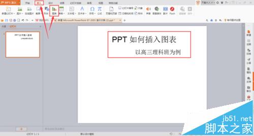 2、可以将幻灯片标题进行简单编辑。点击菜单栏的插入,再单击图表。