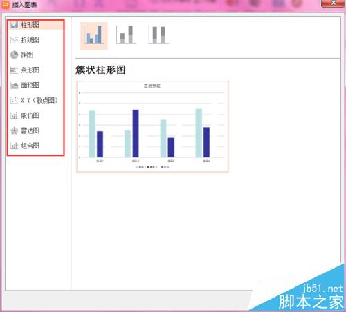 3、弹出插入图表的对话框,可以看到有柱形图、折线图、饼图、条形图、面积图、X Y (散点图)、股价图、雷达图、组合图九种。选择一种你需要的,适合的图表。示范图是以柱形图为例。