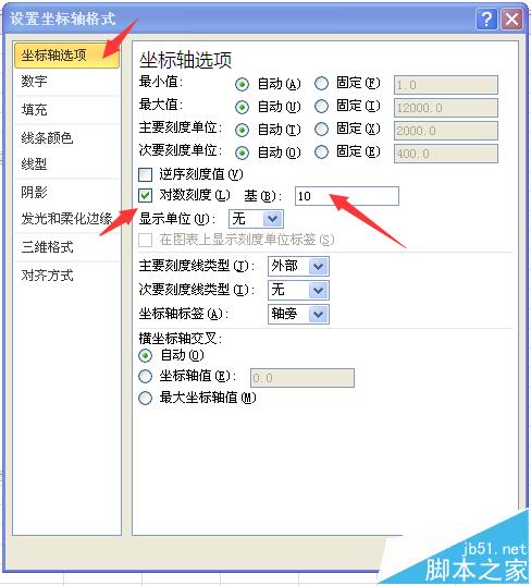 4、首先,我们双击Y轴,调出“设置坐标轴格式”对话框,在“坐标轴选项”选项卡中,选中“对数刻度”,输入框中填10即可,效果如图,此时数据均已正常显示。