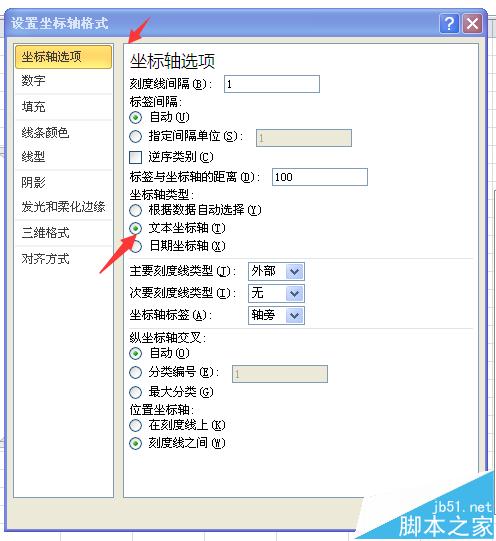 5、接下来,双击分类轴(X轴),调出“设置坐标轴格式”对话框,在“坐标轴选项”选项卡中,“坐标轴类型”选中“文本坐标轴”,关闭后结果如图