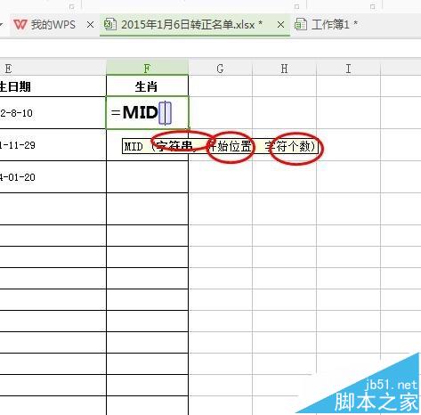 2、我们再在F这一栏也就是生肖这个列,我们先输入=mid()函数。这个函数的意思的引用一个字符串我们从第几个开始选择几个。