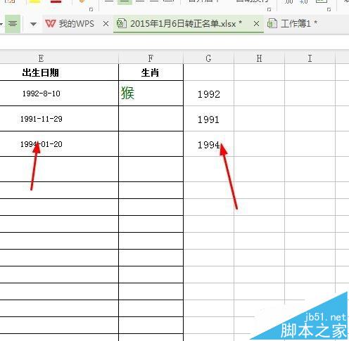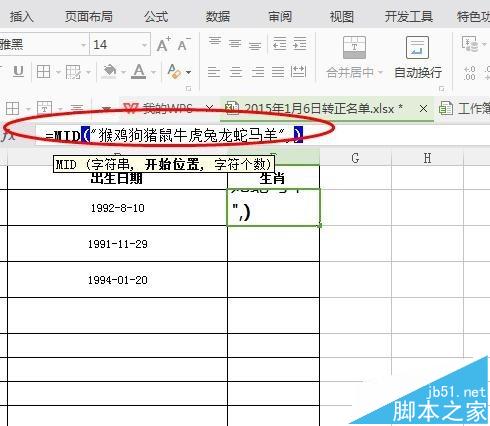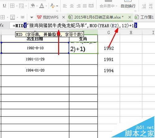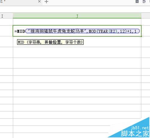 8、最后我们在看输入的是我么要取出多少个,我们应该取得的一个,因为人的生肖就是一个。公式:=MID("猴鸡狗猪鼠牛虎兔龙蛇马羊",MOD(YEAR(E2),12)+1,1)