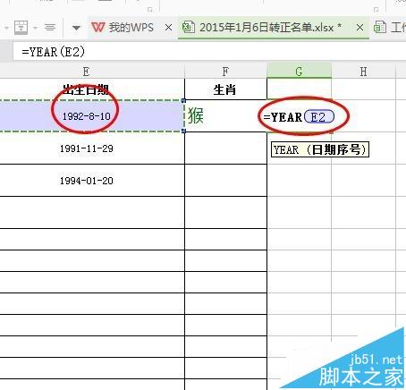 7、如下图所示的是第一个是生肖用双引号框住,第二个是公式E2指的是出生日期那一栏,也是取出生肖的开始位置。