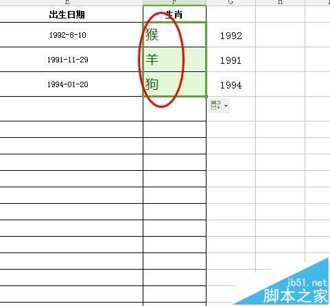 9、最后我们看下求出之后我们下拉一下就可以把后面的生肖都填充料。
