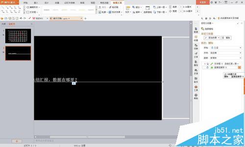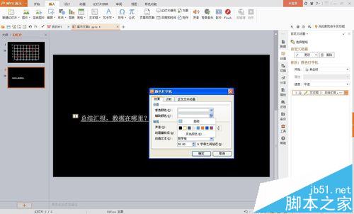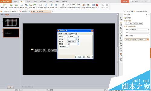 16、下面做一个开始动画,用来引申出前面做的数据曲线。新建幻灯片,背景同样设置为黑色,插入-文本框,输入文字添加下划线,并添加动作进入-颜色打字机,设置颜色属性和计时属性。