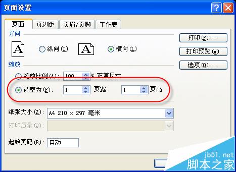7、同样,打开“页面设置”对话框,在“缩放”功能下“调整为”1页宽,1页高,可以很快进行调整。