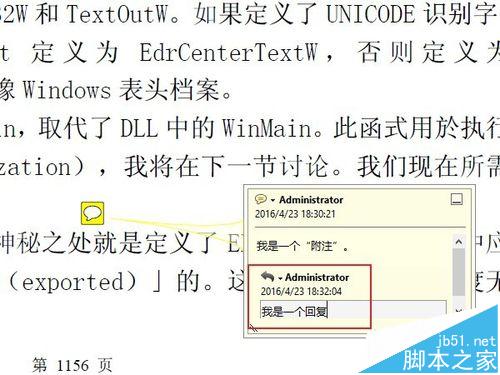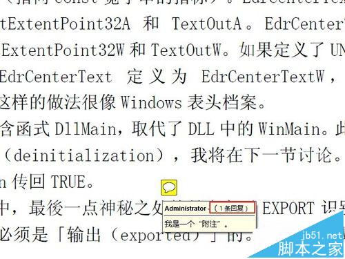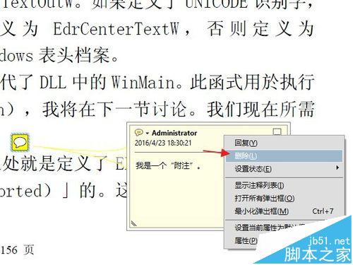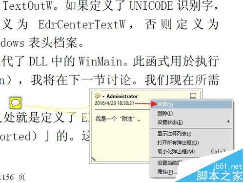 8、实际上,附注的基本功能到此已经够用了。但是有的时候,我们更需要一些比较小众化,或者个性化的需求,下面简要的说几个。比如这个文档添加一个附注后,需要其他不同的用户阅读时,对这条附注里的问题做出回答,或者写下体会,特殊要求,等等。那么可以用到“回复”功能。鼠标右键点击附注,然后选择“回复”。