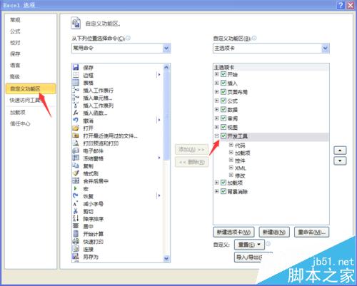 1、先添加窗体控件,窗体控件在功能区“开发工具”里,但Excel2010中开发工具默认是隐藏状态,我们需要找到它。打开“选项”,在“自定义功能区”勾选“开发工具”。