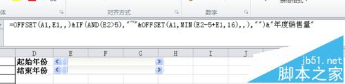 7、在F1列输入公式:=OFFSET(A1,E1,,)&IF(AND(E2>5),"~"&OFFSET(A1,MIN(E2-5+E1,16),,),"")&"年度销售量"。这个公式结果是“X年度销售量”或“X年-X年度销售量”,它昌随着控件的改变而变化的,最终结果会引用为图表标题。