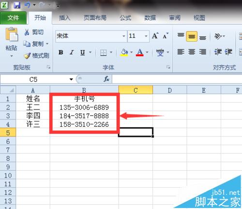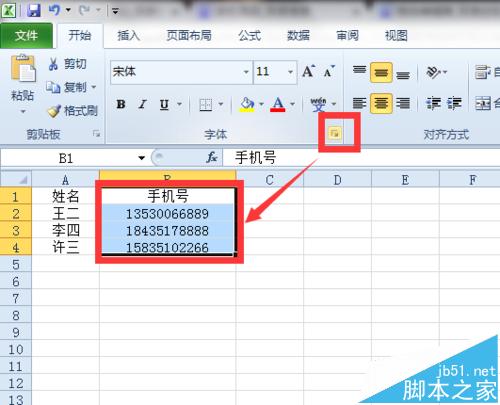 1、我们打开Excel输入姓名和手机号码(这里演示的是虚假的),再全部选中手机号码的部分,我这里是“B1—B4”区域。然后,我们在“开始”菜单的“字体”选项卡里点右下角的三角箭头,就可以打开单元格格式的界面。