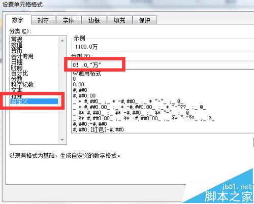 2、接着,我们还是选择“自定义”数字模式,在右侧的类型里面输入0!.0,"万"(拼音输入状态),点下【确定】之后我们就可以看到效果啦~