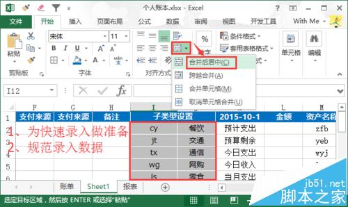 中间为记账类型区:从I-J列,规范和快速绿如数据(子类型设置)