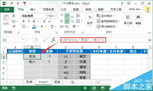 公式解析:如果C2单元格的值 小于 0,则输出“支出”,否则输出“收入”。简单的说,如果是负数,将设置B2单元格设置为“支出”,反之“收入”