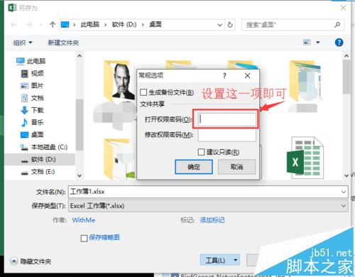 2、在保存界面上,找到“工具”,并下拉选择“常规选项”,点击后,在弹出的界面上,在“打开权限密码”设置上自己的密码,进设置这一项即可,再次启动该Excel,则会要求输入密码,才能打开。
