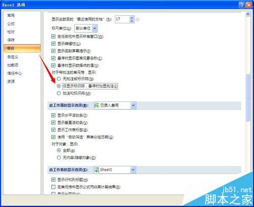 4、选择高级--显示--对于带批注的单元格,显示--勾选第二个,确定