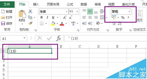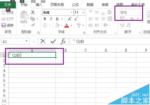 4、或者我们可以使用快捷方式,在单元格内输入“‘(18)”,输入之前加一个‘符号,就表示把单元格格式变成了文本的格式了,实现与上面的一样的效果