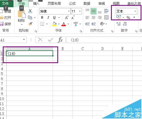3、那么我们要做的就是删除原单元格的内容,将其变为文本格式就可以了,我们先把单元格格式设置成文本,然后输入(18),回车,发现显示还是“(18)”