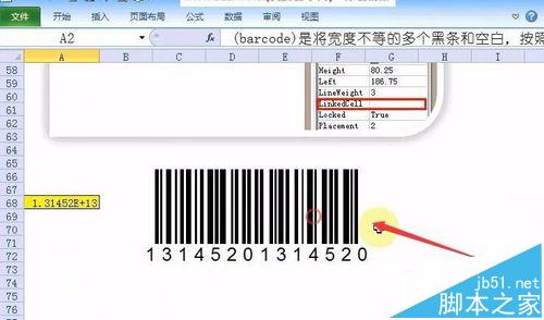 9、我们需要将条形码下方的数值改成我们自己的内容,这时可以在空白处先输入我们的数值,再用鼠标选择条形码,点击鼠标右键,打开属性,在列表中找到“LinkedCell”,然后在后面的空白格里输入刚刚输好的数值的行列号即可,如图: