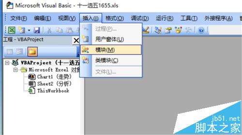 3、插入模块,在模块1中准备编写程序。