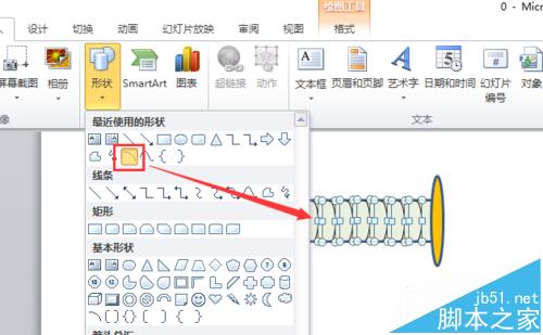 4、接着,选择“弧线”工具,在长条矩形内绘制多个半弧,并单击鼠标右键,选择“设置对象格式”选项,将其颜色和线条大小进行设置,如图所示。