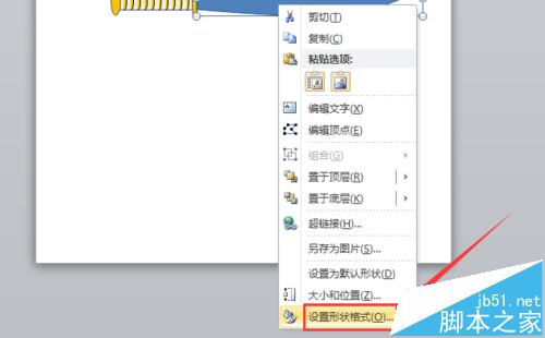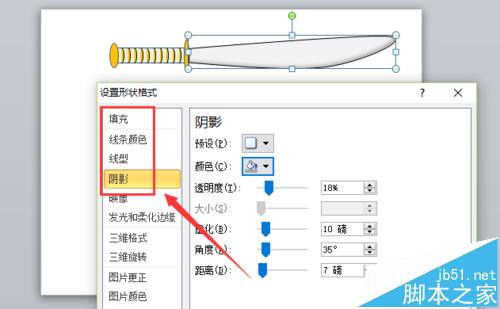 5、接着,选择“曲线工具”,在页面中绘制出一个水果刀身的形状,并单击鼠标右键,选择“设置形状格式”选项,对其颜色、线条和阴影进行设置,如图所示。