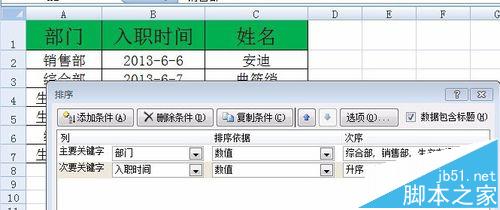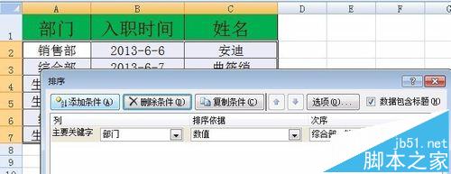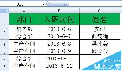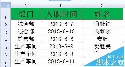1、数据表格如图中所示,各部门按照综合部、销售部、生产车间的顺序排序,部门内按照入职时间的先后顺序排序。