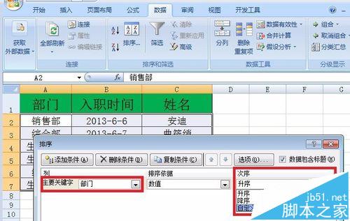2、先来首先来解决部门排序的问题,很显然这种情况是普通的升序或者降序所无法解决的,我们需要引入一个全新的方法,叫做“自定义排序”。选择单元格数据区域-工具栏数据-排序,在弹出的排序对话框中,主要关键字下拉列表选择“部门”,次序下拉列表区选择“自定义序列”。