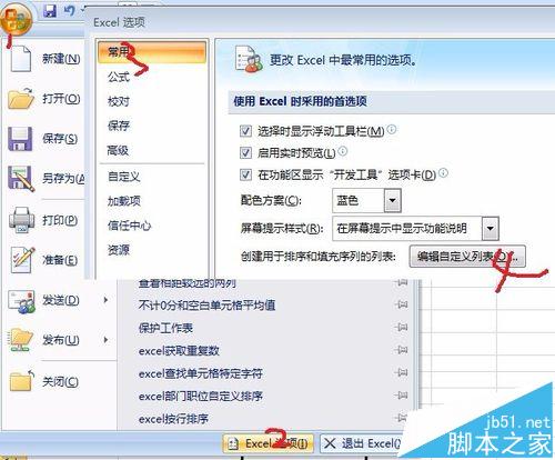 6、如果后期出现新增了部门的情况,小伙伴们也可以通过修改自定义序列来实现部门排序。Office按钮-excel选项,在弹出的Excel选项对话框中,选择“常用”选项卡,找到“编辑自定义列表”后单击。