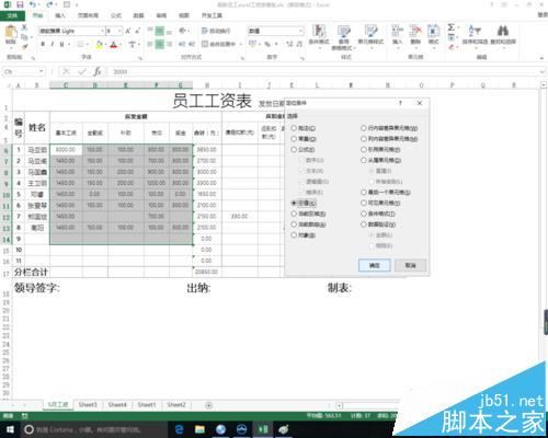 4、按下F5键,或者在开始标签面板中点击查找与选择按钮,在下拉菜单中选取定位条件选项。在定位条件中选择空值定位。点击确定。