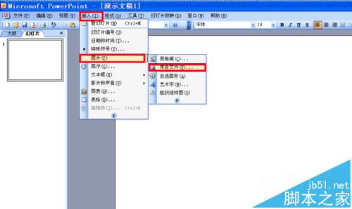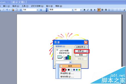 3、打开ppt,新建一个演示文稿。点击菜单“插入”——“图片”——“来自文件”,在插入图片对话框中选择之前制作的烟花素材,点击“插入”。因为烟花都是在夜空中绽放,所以这里小编要把背景设置为黑色,点击菜单“格式”——“背景”,选择黑色背景,点击应用。
