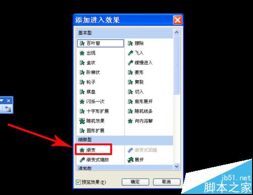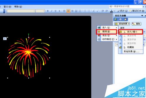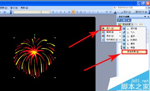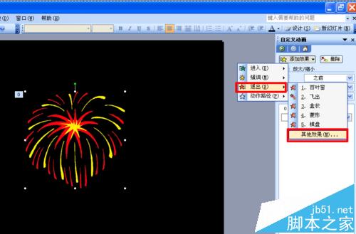6、选择“添加效果”——“退出”——“其它选项”,在“其它选项”对话框中选择“渐变”,开始项选择“之前”,速度项选择“非常快”。1个烟花动画效果就制作好了。