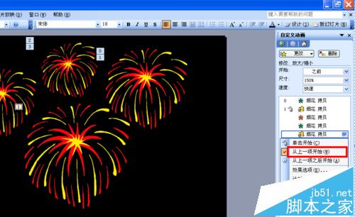 2、后面几个烟花动画的播放一定要选择从上一项开始,不然播放的时候要鼠标点击才会播放。