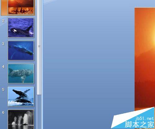 1、首先,我们准备八张鲸的图片,分别放置在八张幻灯片上。这里是调整好图片大小的幻灯片显示。