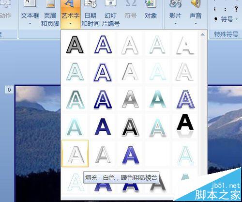 5、插入——艺术字——暖色粗糙棱台。输入“鲸”,选中该字,在字体面板中字体选“微软雅黑”、字号输入200(输入字号后,需回车确认),字色如图。