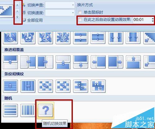 12、选中所有幻灯片,点开动画——切换效果右侧下拉箭头,为幻灯片选择随机切换效果。切换时间00:01。完成整个动画。