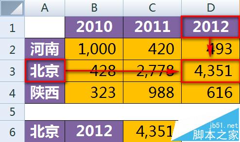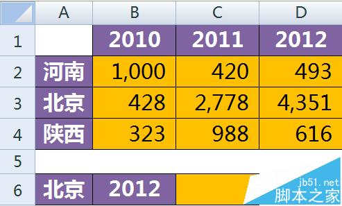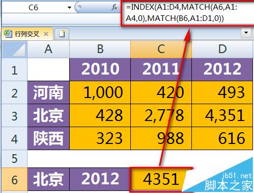 1、如图,A1:D4是一个二维表。需要根据A6和B6单元格指定的内容返回数据。
