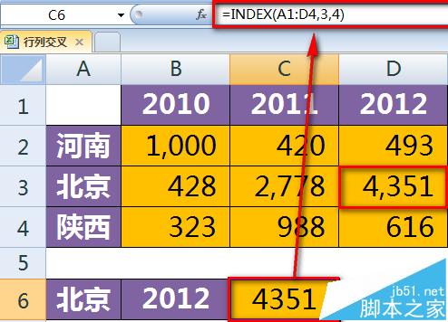 2、根据A6和B6单元格内容,我们可以看到要取的值是A1:D4中第三行第四列的内容。我们利用INDEX()函数可以提取出相应内容。双击C6单元格,输入公式:=INDEX(A1:D4,3,4)
