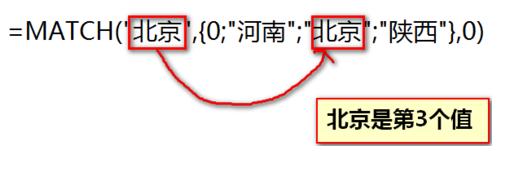 5、知识点说明:MATCH()函数返回第一参数在第二参数所在的位置。如下图,“北京”在第二参数的数组中是第3个值,因此函数返回3。