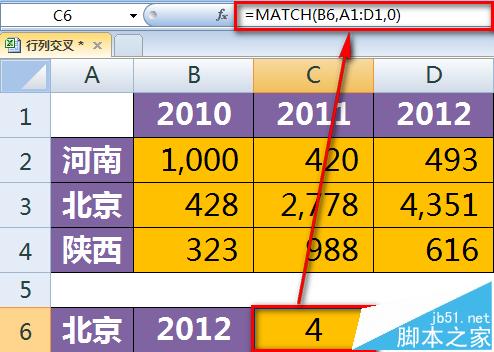 6、同样,利用MATCH()函数返回B6单元格内容所在列数。双击C6单元格,输入公式:=MATCH(B6,A1:D1,0),结果返回4。